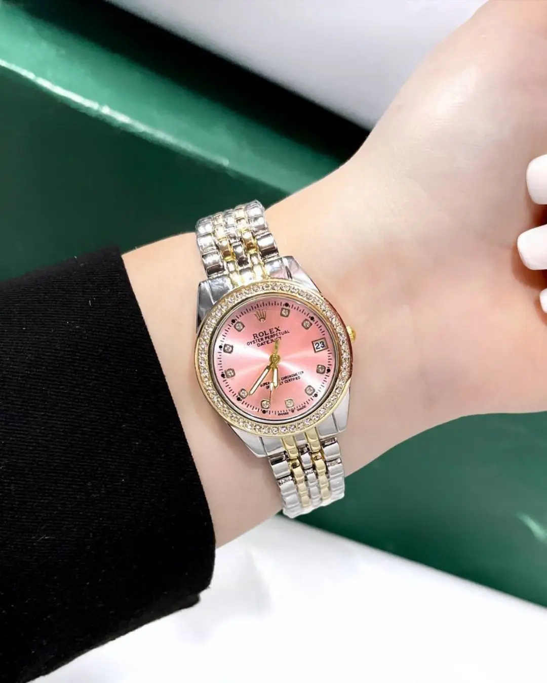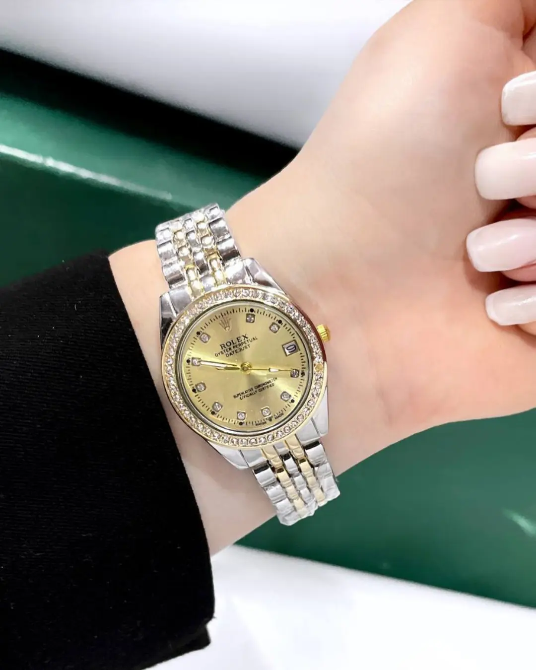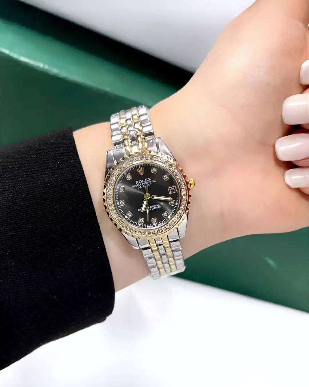 ستايل ملكي بلمسة براقة: نفس تفاصيل رولكس الأصلية، بس بسعر أخف بكتير! تصميم مرصع وألوان لافتة تكمّل أي لوك.